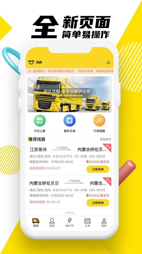 全新的首页界面搭配简单易上手的操作方式,能让每位货车司机快速完成抢单操作。