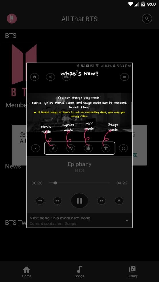1.离线听歌功能:收录了防弹少年团出道以来的全部歌曲,使用离线听歌功能时无需消耗流量,可尽情享受音乐。