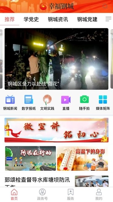 《幸福钢城》客户端整合电视、报纸、刊物、公众号等平台资源,第一时间准确、权威地发布本地新闻资讯,其一级栏目设置为“首页、政务号、问政、服务、我的”五大板块,致力于打造集“新闻+政务+服务”功能于一体、贴近群众日常生活的客户端,成为宣传钢城形象、服务广大群众的重要渠道与窗口。