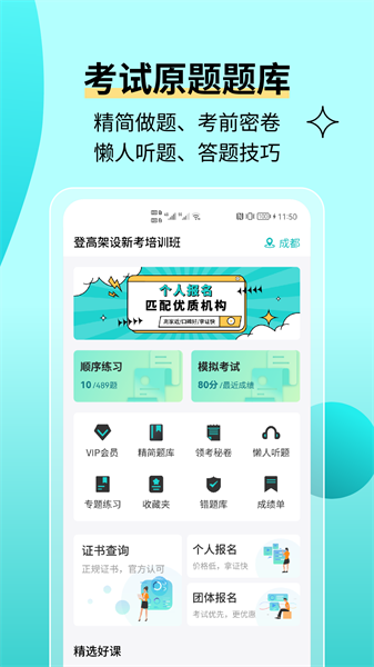 高处作业考试题库是一款专为刷题学习打造的软件。它为用户提供了丰富且更新及时的题库资源,涵盖当前行业最新、最前沿的专业知识;同时设置了多种练习与考试模式,用户可从基础内容着手练习,逐步积累并掌握更多知识要点。系统会自动记录练习成绩与错题情况,帮助用户快速定位自身薄弱环节,以便后续开展针对性复习。此外,软件还整合了报考相关的资讯与指导教程,助力用户更顺利地获取证书。