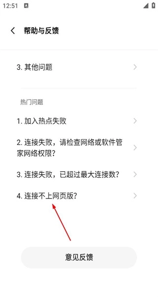 打开软件后,在帮助与反馈页面查看其他问题及热门问题列表,选择“连接不上网页版”选项,即可进入对应的帮助详情页面。