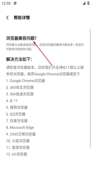 3、进入浏览器兼容问题的帮助详情页面,阐述该问题所造成的影响,并列举出受支持的浏览器具体类型及其对应的版本信息。