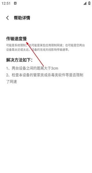 4、进入传输速度慢的帮助详情页面,说明该问题可能存在的原因,并列出调整设备距离等相应的解决办法。