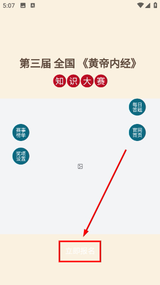 3、可以借助【每日答题】【赛事榜单】等功能来参与互动,点击【立即报名】按钮,就能完成第三届全国《黄帝内经》知识大赛的报名流程。