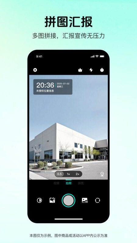 3、做日报时无需使用PS拼图,只需挑选几张照片,就能一键生成带有水印的汇报图,时间和地点信息会自动添加进去。