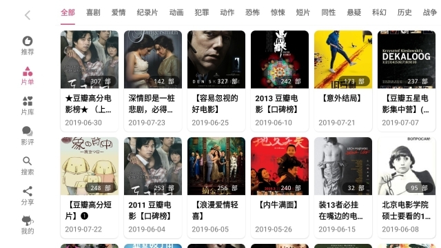 2.点击左侧导航栏的“片单”选项,即可查看喜剧、爱情、纪录片等各类影视分类。