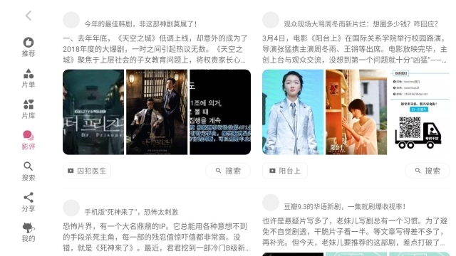 4.点击影评按钮,在当前页面就能浏览到各类影视剧的最新影评内容。