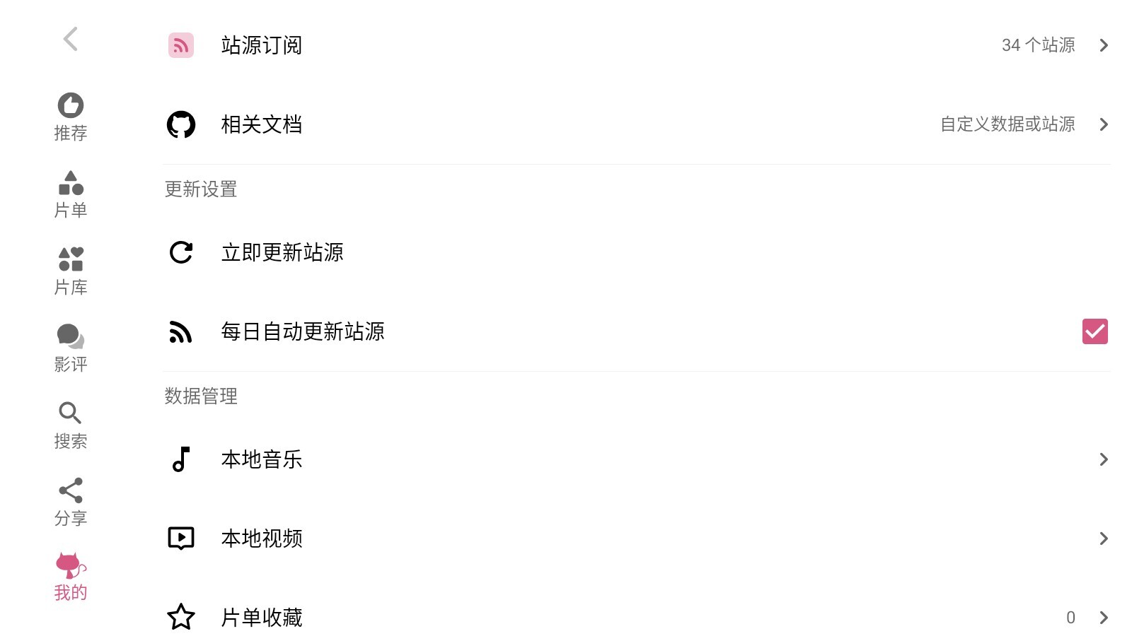 6.点击“我的”按钮,就能看到站源订阅、更新设置、数据管理等功能选项。