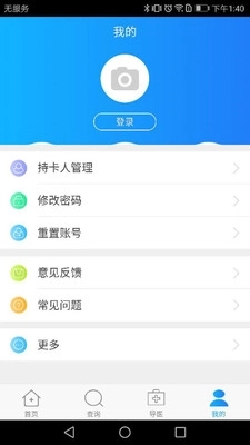 个人中心包含以下功能:持卡人管理、密码修改、账号重置、意见反馈、常见问题及更多选项。