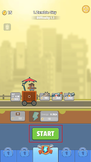 1、在关卡界面,确认好携带的道具后,点击【START】按钮,即可进入僵尸围城的关卡挑战环节。