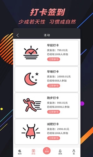 2、签到打卡:目标开启后,每日达成目标并完成签到打卡,可通过文字、图片等形式进行签到,同时分享您的感受。