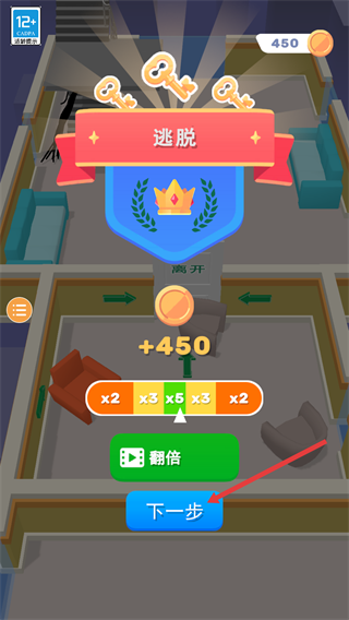 4、成功逃脱后将获得【450】金币作为奖励,点击【下一步】即可进入全新关卡继续进行挑战。