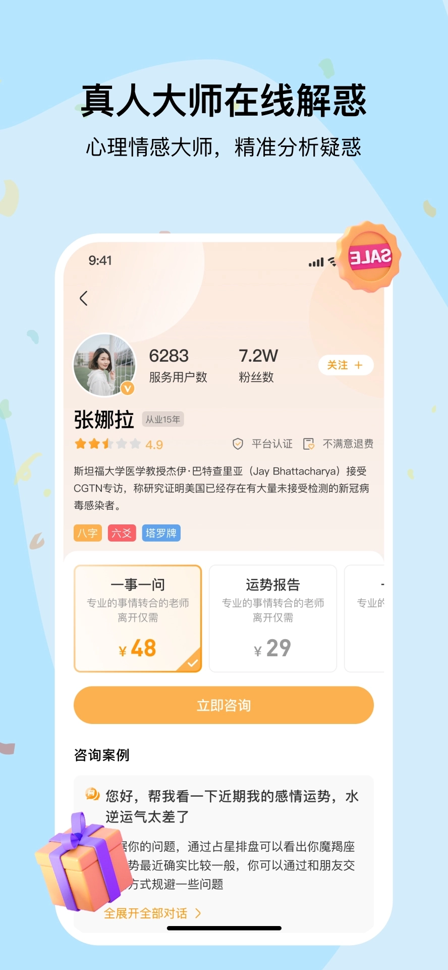 2、提供塔罗牌占卜、星盘解读等多种占卜功能,满足用户探索未来的好奇心。