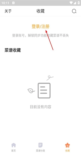 进入收藏页面后,会看到登录注册提示以及菜谱收藏板块,点击这个提示就能进入相应的登录注册操作页面。