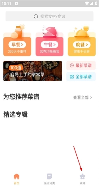 打开软件后,首页设有早餐、午餐、晚餐的分类板块以及推荐菜谱内容,点击底部的收藏按钮即可进入对应的收藏页面。