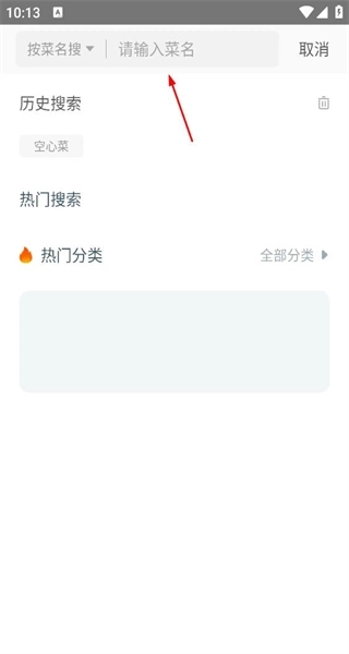 4、回到软件首页后,点击搜索栏进入搜索页面,浏览历史搜索与热门搜索的内容,随后准备输入菜名进行搜索。