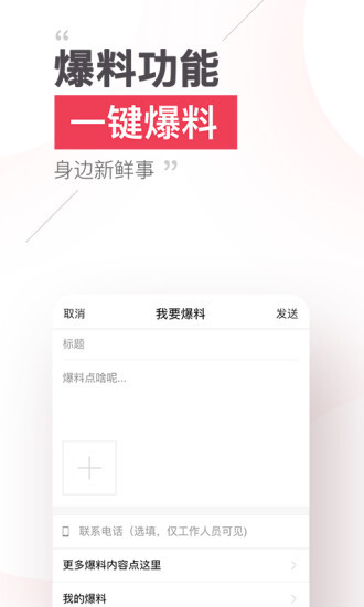 随时随地都能上传新闻事件的照片与文字,一键就能爆料身边的新鲜事,百人爆料团正等着你来加入,还有红包可以领取哦。