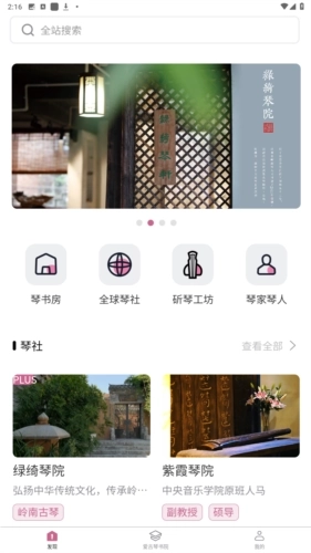 2、成功进入后,找到并进入发现板块。该板块内设有琴书房、全球琴社、琴家琴人、古琴谱书等选项,用户可依据自身需求自由选择。