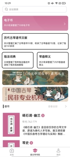 4、点击进入爱古琴书院板块,这里已收录整理了10本电子书,同时还包含大量谱书、古代古琴历史文献、琴曲释义等丰富内容。