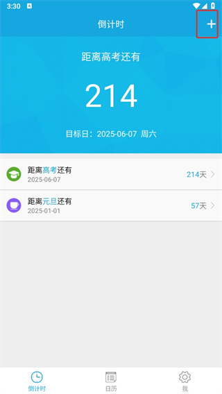 1、在手机上打开新高考倒计时应用,进入其主页面。 2、在主界面中,点击右侧上方的加号按钮。