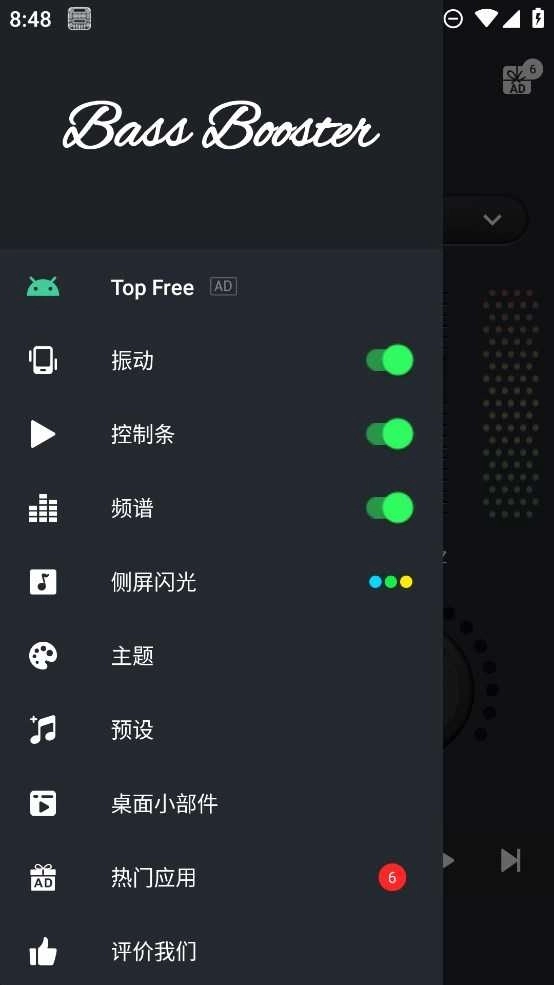 2、进入低音增强器界面后,可借助滑动操作或点击按钮的方式,对低音效果的强度以及音效调节相关选项进行调整。