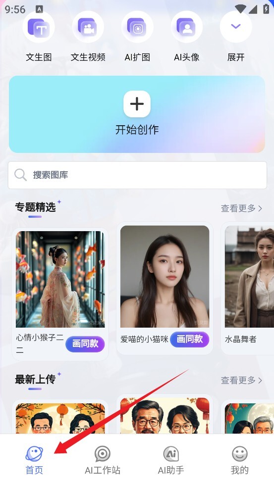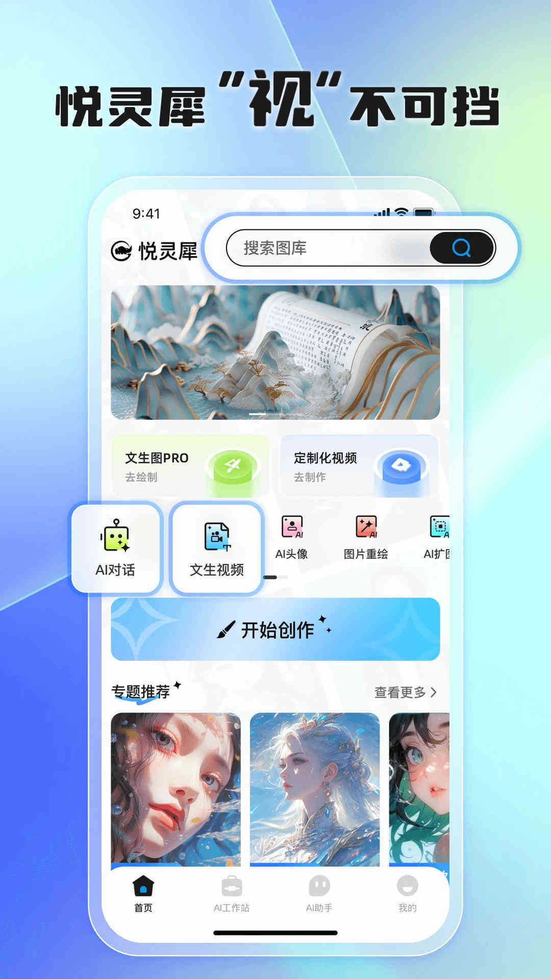 1、打开悦灵犀后,进入【首页】就能看到文生图、文生视频、AI扩图、AI头像等功能模块