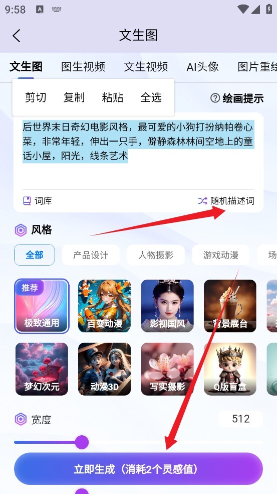 3、接着,用户需在创意描述对话框中输入提示词以生成图片,这些提示词应涵盖充足的信息;也可以点击随机描述词。举例来说,若输入“后世界末日奇幻电影风格,最可爱的小狗装扮成纳帕卷心菜,十分年幼,伸出一只爪子,僻静森林林间空地上的童话小屋,阳光,线条艺术”,AI便会依据这些描述,生成一幅包含蓝天与白云的图片。