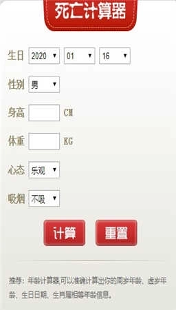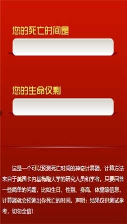 这是一款能预测死亡时间的神奇计算器,其计算方式源于美国卡内基梅隆大学的研究人员与学者。只需回答生日、性别、身高、体重等一些简单问题,计算器便能预测出你的死亡时间。特此声明:结果仅作测试参考,切勿完全相信!