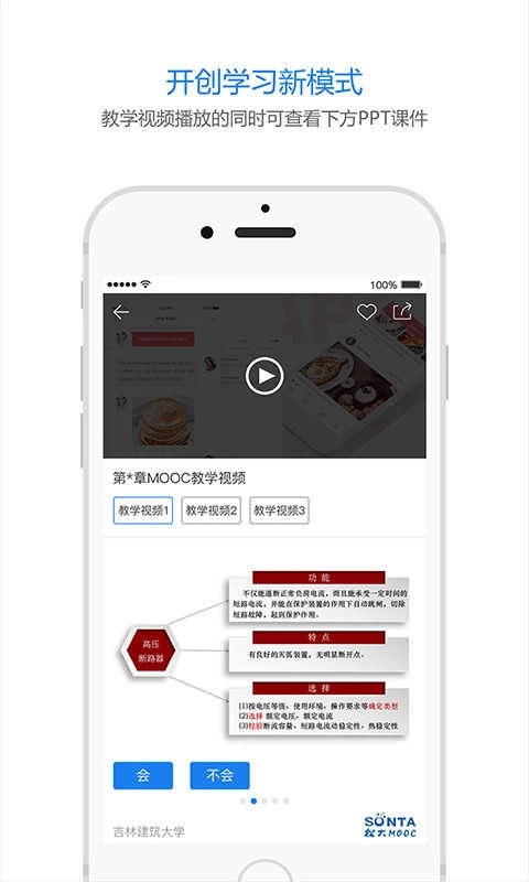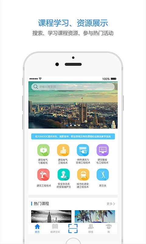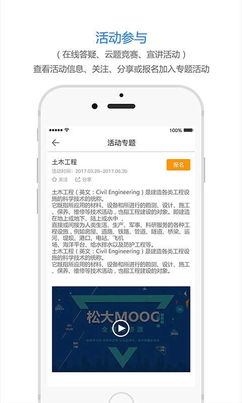 松大慕课具备教学全流程的助教、助学、助练、助考功能。用户可随时随地学习平台上的专业课程;云题模块支持师生随时组卷、练习、考试及成绩分析;通过终端的“扫一扫”功能扫描松大MOOC全媒体系列教材的二维码,即可获取全媒体教学资源;群组功能则为专家、教师与学生搭建了交流互动的平台。