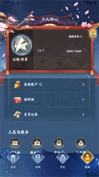 2、打开应用后,进入主界面,点击【我的】页面,接着选择【注册/登录】选项。