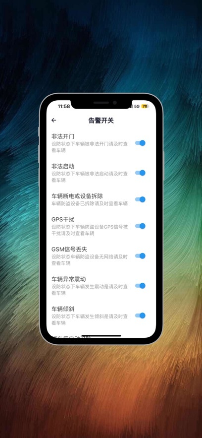 斌斌安防软件不仅可以感应汽车的异常状况,还支持查询车辆当前位置、历史轨迹、车速等信息;进入设置界面后,用户能够自定义开启或关闭告警开关,一旦打开警报开关,系统在检测到异常时会立即发出警告,从而保障爱车的安全!