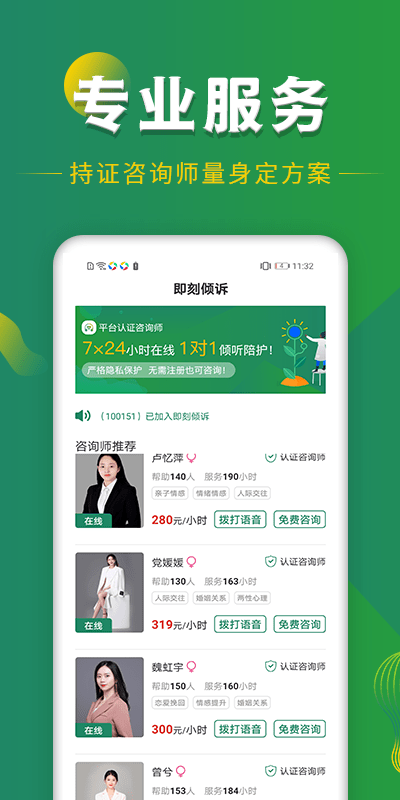 有限时免费咨询的咨询师,线上沟通很方便,支持语音沟通的功能。