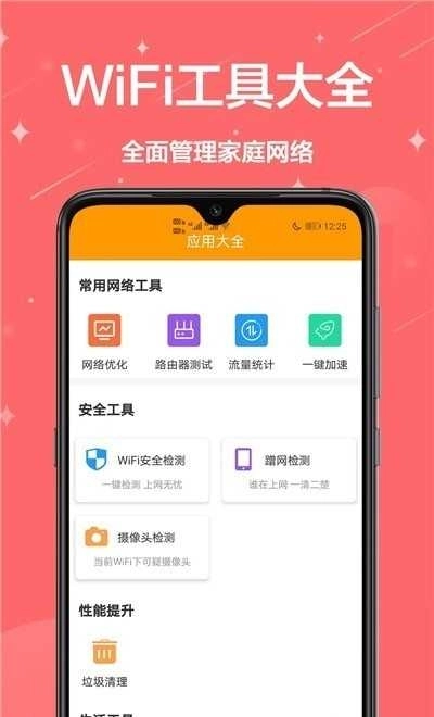 4、WIFI工具大全:全方位守护上网环境,支持热点安全检测,有效保障信息安全;具备网络优化功能,一键加速,确保上网安全无忧。