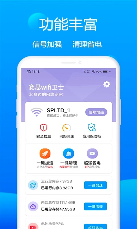 2、周边WiFi信号清晰可见,能帮你做出最优选择,还附带手机清洁功能。