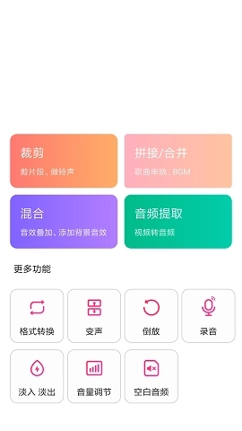 音频剪辑提取是一款影音编辑类的应用软件,用户可借助它完成音乐与视频的编辑操作。该软件具备多种功能,除了能对音频文件进行拼接、合并,以及自由截取不同音乐片段外,还支持调整音频速度和进行混音处理,从而让用户能够根据不同需求创作出风格各异的音频内容。