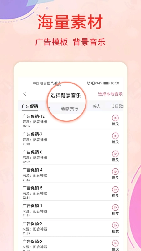 2、这里还提供海量素材背景音乐,只需选择音乐类型,就能为您的音频添加背景音乐,轻松营造氛围;