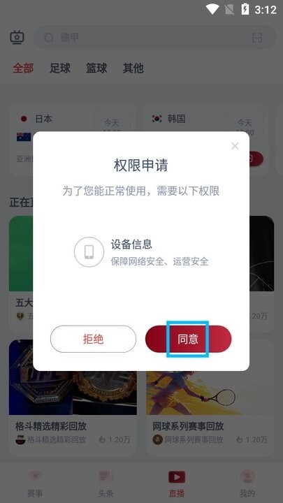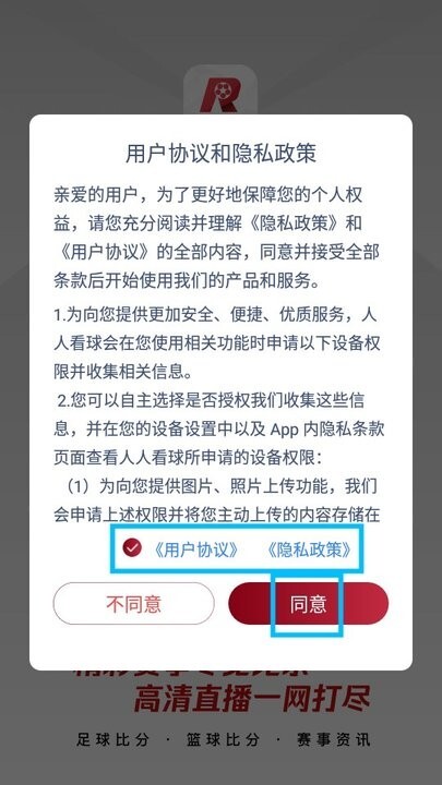 ·在安卓网打开人人看球,阅读弹出的用户协议与隐私政策;