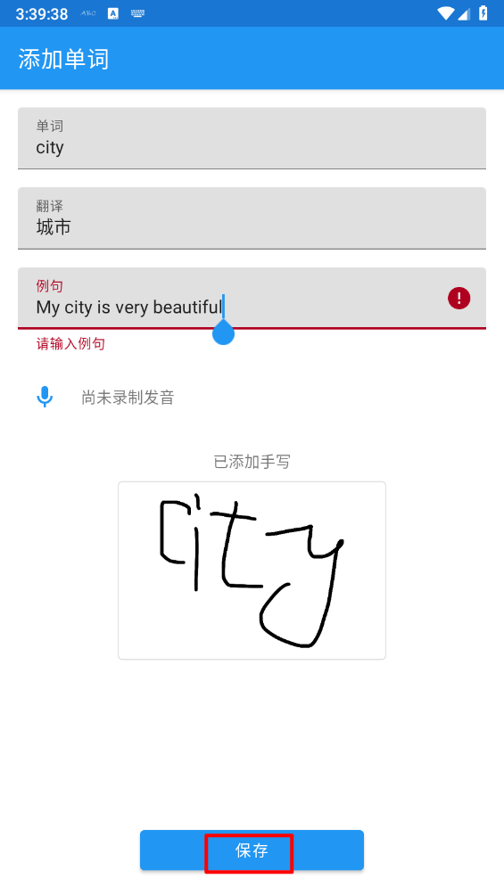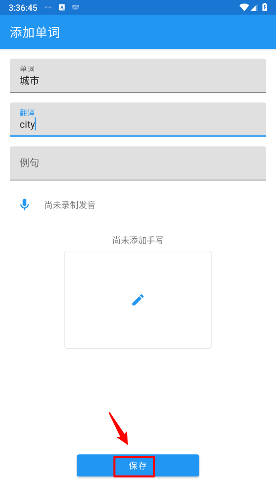 4、在主页可输入单词、翻译及例句,此外还能添加手写内容。