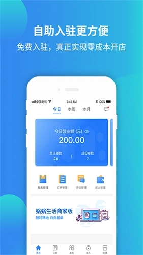 商家使用蜗蜗生活商家版可以随时随地的自由接单。