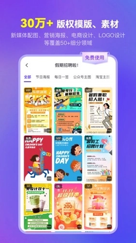 40万+精美海量模板,企业招聘、活动海报、会议邀请函、节日促销等,多种选择.