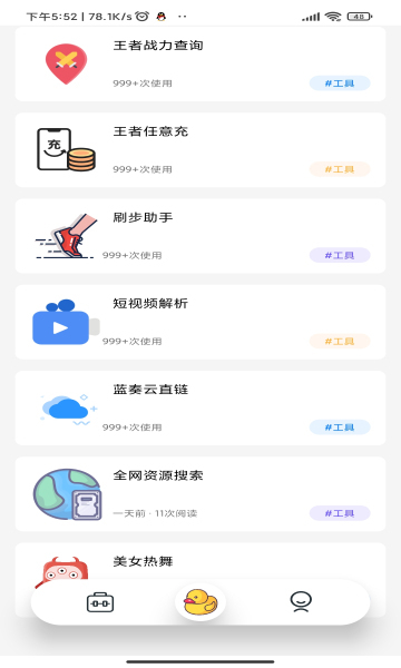 包含:战力查询 王者任意充 刷步助手 全网短视频解析 蓝奏云直链 美腿福利 小姐姐视频。