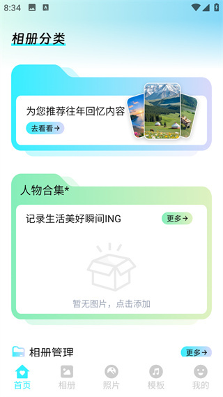 1、进入首页后,可使用人物合集、相册管理等功能,还能了解相册分类情况。