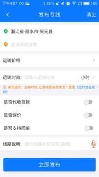 3、点击发布按钮,即可快速发布各类货源、车源及线路信息,助力货物运输轻松完成