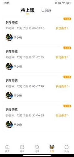 应用内设有购课、约课、上课与个人中心四大功能板块。用户可借助微信或支付宝购买课包,在规定时段内灵活规划课程安排;约课环节便捷高效,仅需选定喜爱的乐器、合适的老师以及心仪的时间,就能完成预约流程;上课前,用户只需提前上传待练习的乐谱,到了预定时间进入教室,即可体验与老师一对一的在线陪练服务;个人中心提供上课提醒、消息推送等功能,便于用户随时查阅上课记录和购买历史。