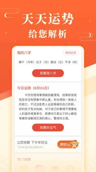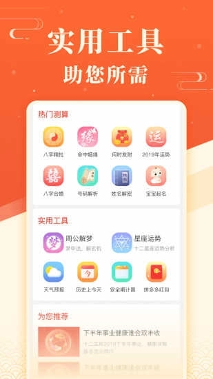 实用工具涵盖解梦、月经记录、吉日查询、求签、铃声设置、壁纸更换等功能,实现了传统文化与现代生活的巧妙融合。