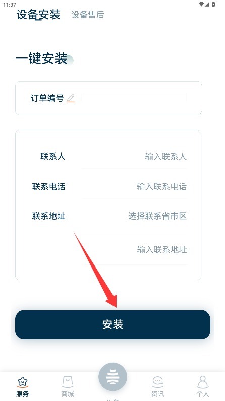 3、请在服务页面按顺序填写订单编号、联系人相关信息以及安装地址,仔细核对确认信息准确无误后,提交安装申请即可。