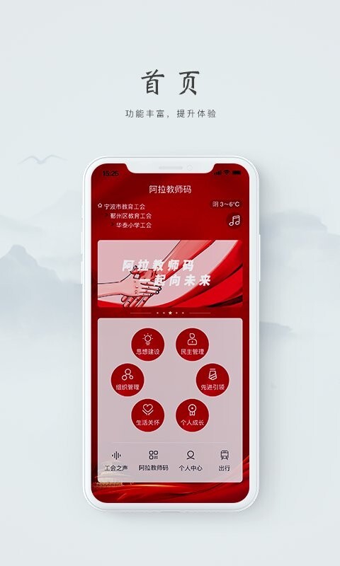 这是专为宁波教师群体打造的生活教学融合服务平台,致力于让教育工作者的日常更便捷、更精彩。在这里,您能随时参与教育相关的线上投票并即刻查看结果,体验贴心的工会服务,了解最新教职工活动资讯,便捷完成活动报名与考勤管理。