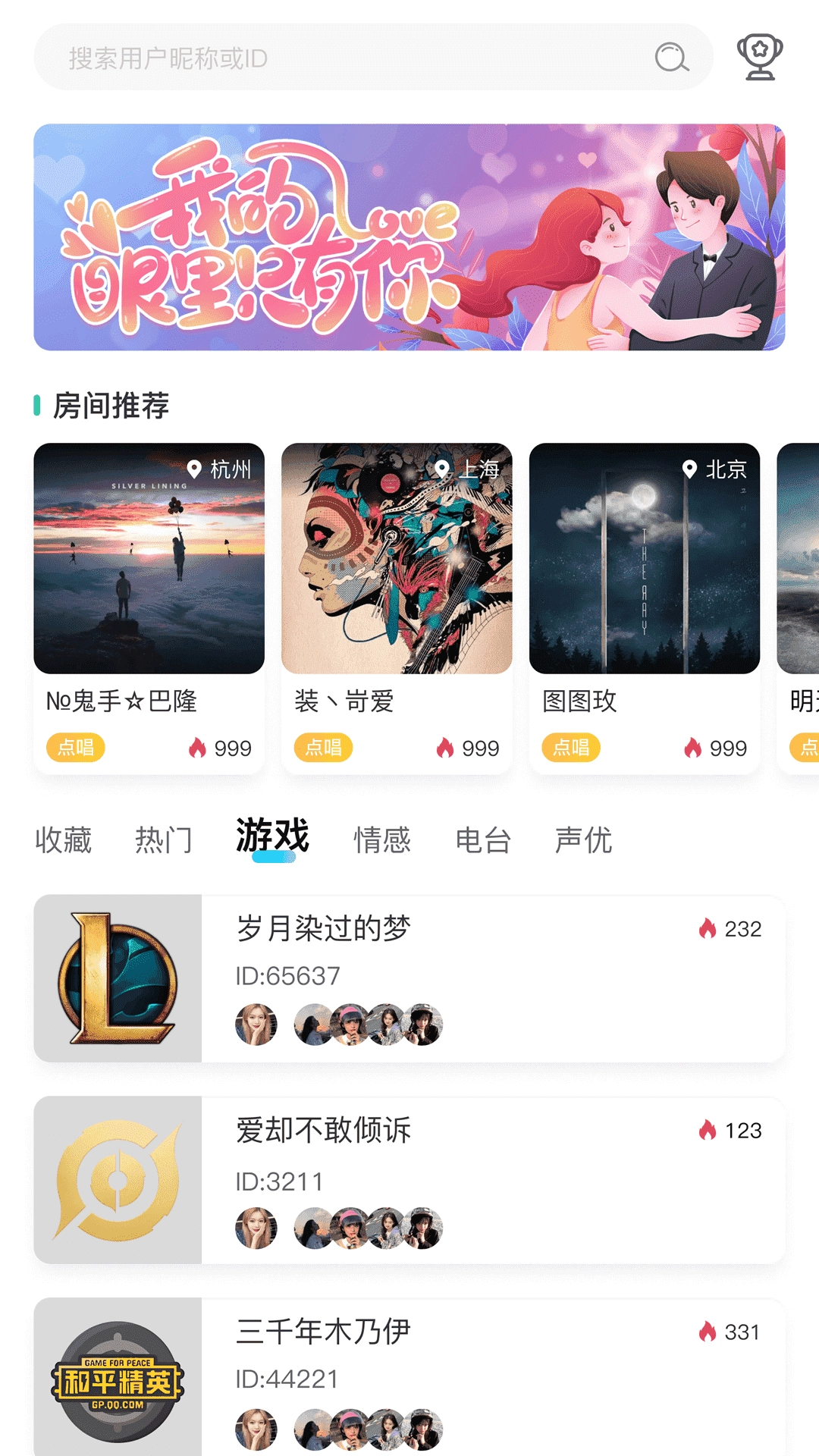 用户可以在这里寻找感兴趣的房间,找到共同话题与他人展开趣味互动,自由探讨,感受优质的掌上社交过程;