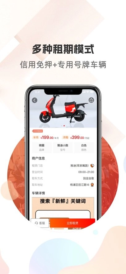 这是一款为骑手征途保驾护航的软件,所有车辆的租用基础价格等信息,都会在线上向用户透明展示。用户还能根据自身大致使用时间等情况进行分析,在线办理适合自己的租用套餐。