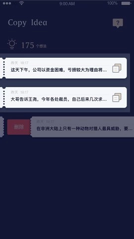 打开手机里的任意一个应用复制文本(无需粘贴,也不用返回操作),每复制一次就会在这里新增一条想法记录。